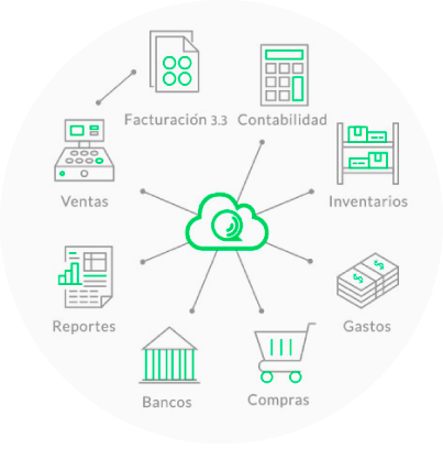 Factura, Boleta, Nota de Crédito, Facturación Electrónica, Cuentas por cobrar, Inventario, Planilla, Almacén, Cuenta Corriente, Caja, Banco, Tesorería.